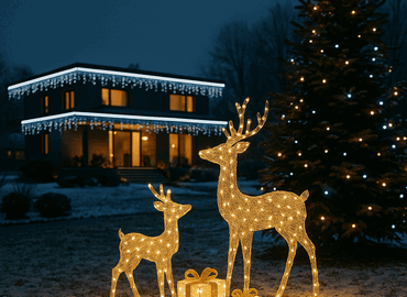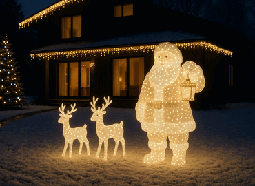 ✔ А двор можно преобразить с помощью светящихся фигур сказочных героев, декоративных елочных элементов и гирлянд, предназначенных для украшения деревьев.