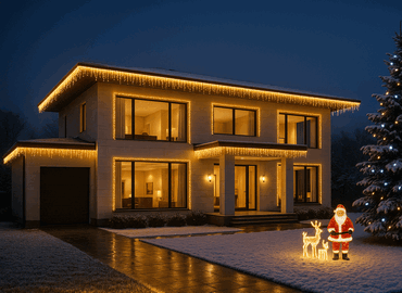 ✔ Светодиодная бахрома с эффектом мерцания, закрепляемая на крыше и вдоль карнизов, добавит большей яркости и магии праздника.