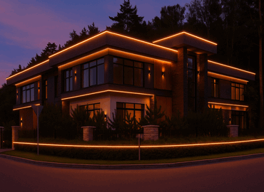 ✔ Для украшения дома или любого строения используется гибкий неон, представляющий собой цельный и достаточно эластичный шнур со светодиодами внутри, который имеет равномерное насыщенное свечение и придаёт зданию футуристический вид.